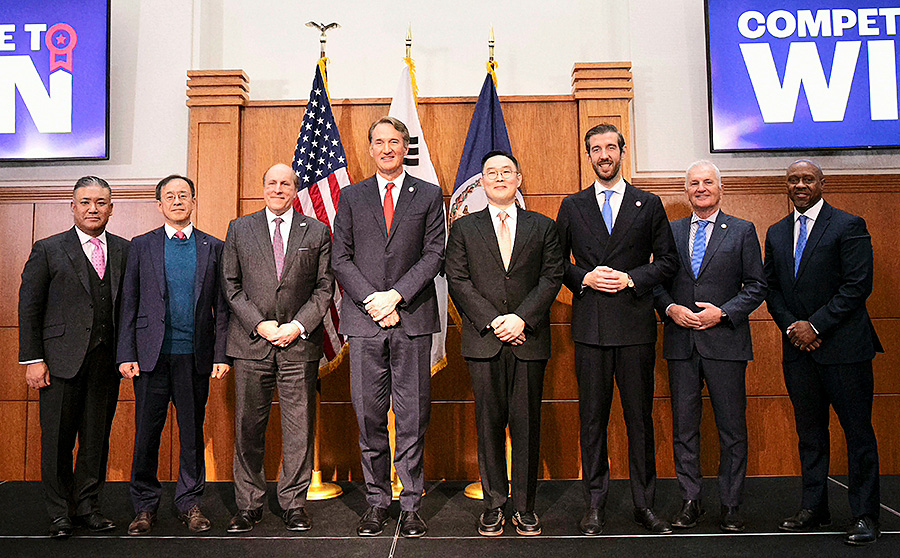 Photograph) On December 12 (local time), attendees pose for a commemorative photo at the announcement of the rare earth magnet plant investment in Chesapeake, Virginia. Pictured from third from left are U.S. Deputy Secretary of Commerce Paul Dabbar; Governor of Virginia Glenn Youngkin; and CEO of LS Cable & System Koo Bon-kyu.